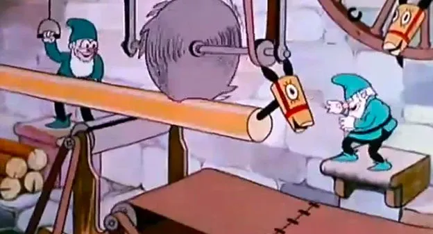 The animation is stop-motion style; the characters are made of wood and felt, and the machines are made of cardboard.